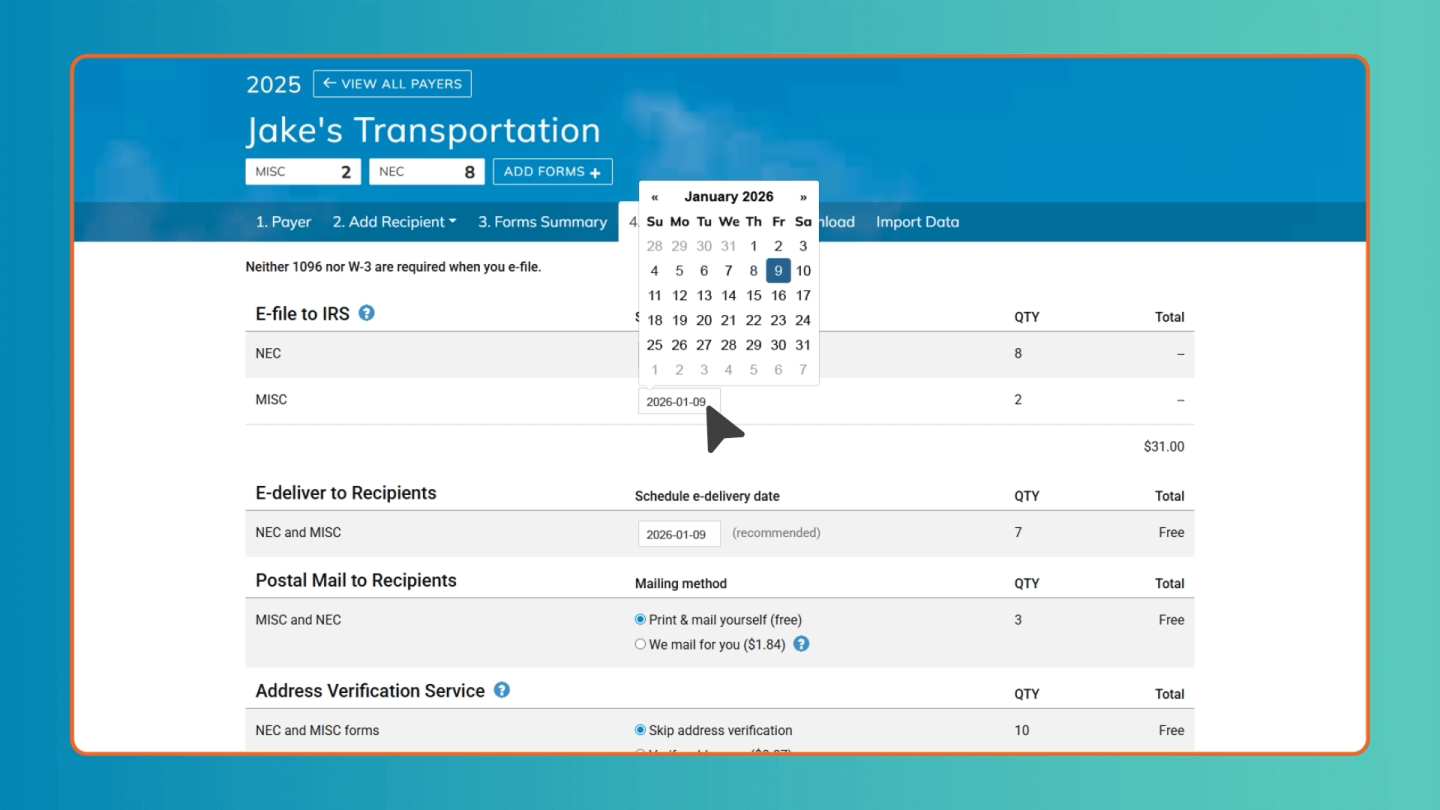 The IRS, states, recipients, TIN and address matches — it’s all in one place. Just get your credit card ready and schedule them all at once (or have them count toward your subscription).